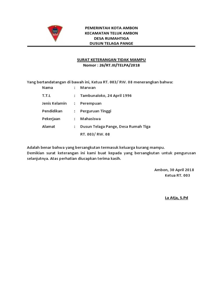 Yang kurang keuangannya dan tidak mampu membayar penasehat hukum pribadi. Surat pengantar dari kelurahan dan diketahui kecamatan. Contoh surat keterangan tidak mampu kelurahan. Surat keterangan tidak mampu bisa diurus dengan . Kamu bisa melihat contohnya di artikel ini!